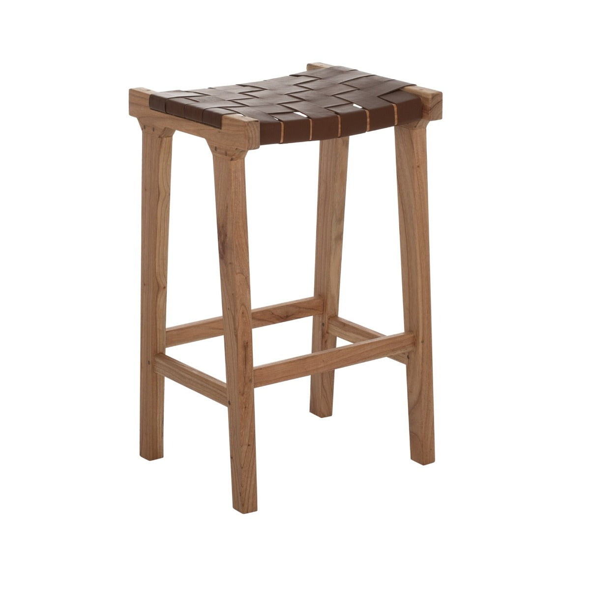 Scaun de bar in linii clasice realizat cu sezut din piele PU tricotata si cadru din lemn masiv de tec.