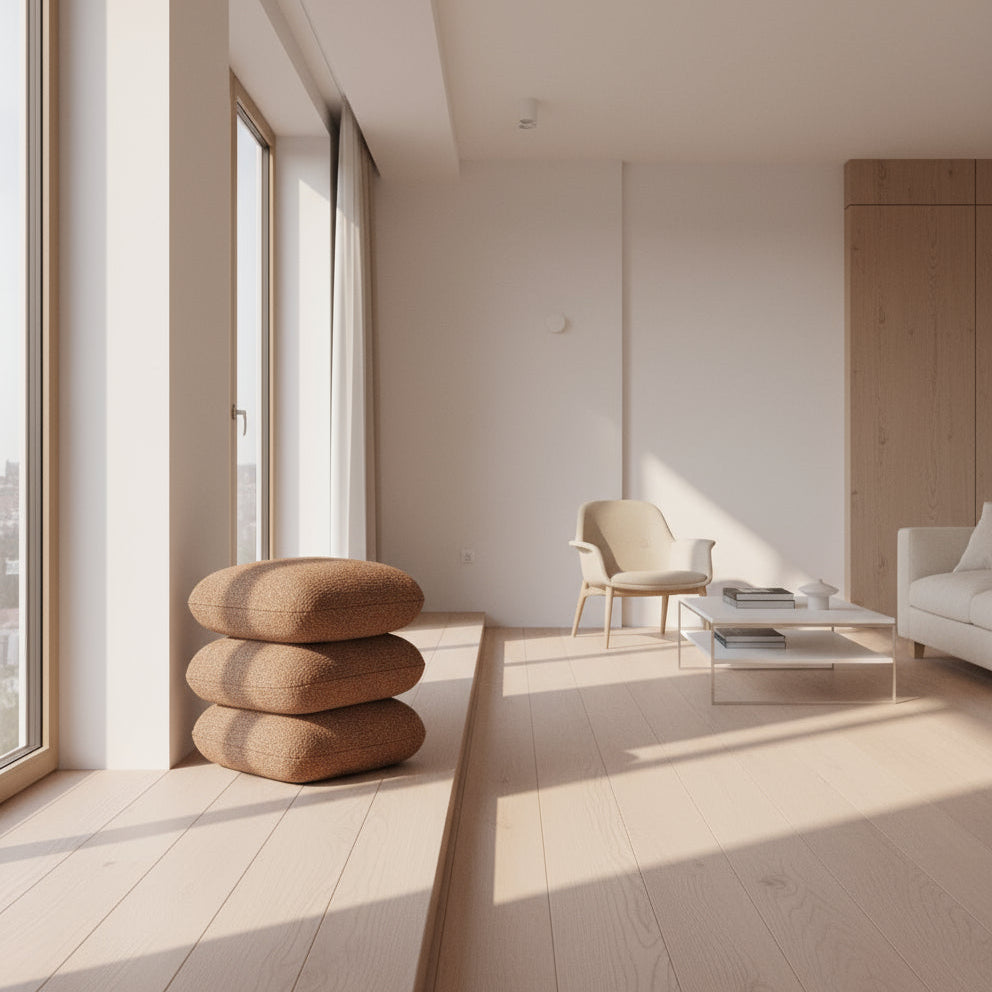 Taburet cu cadru din lemn de eucalipt, tapiterie din 100% poliester cu efect boucle.