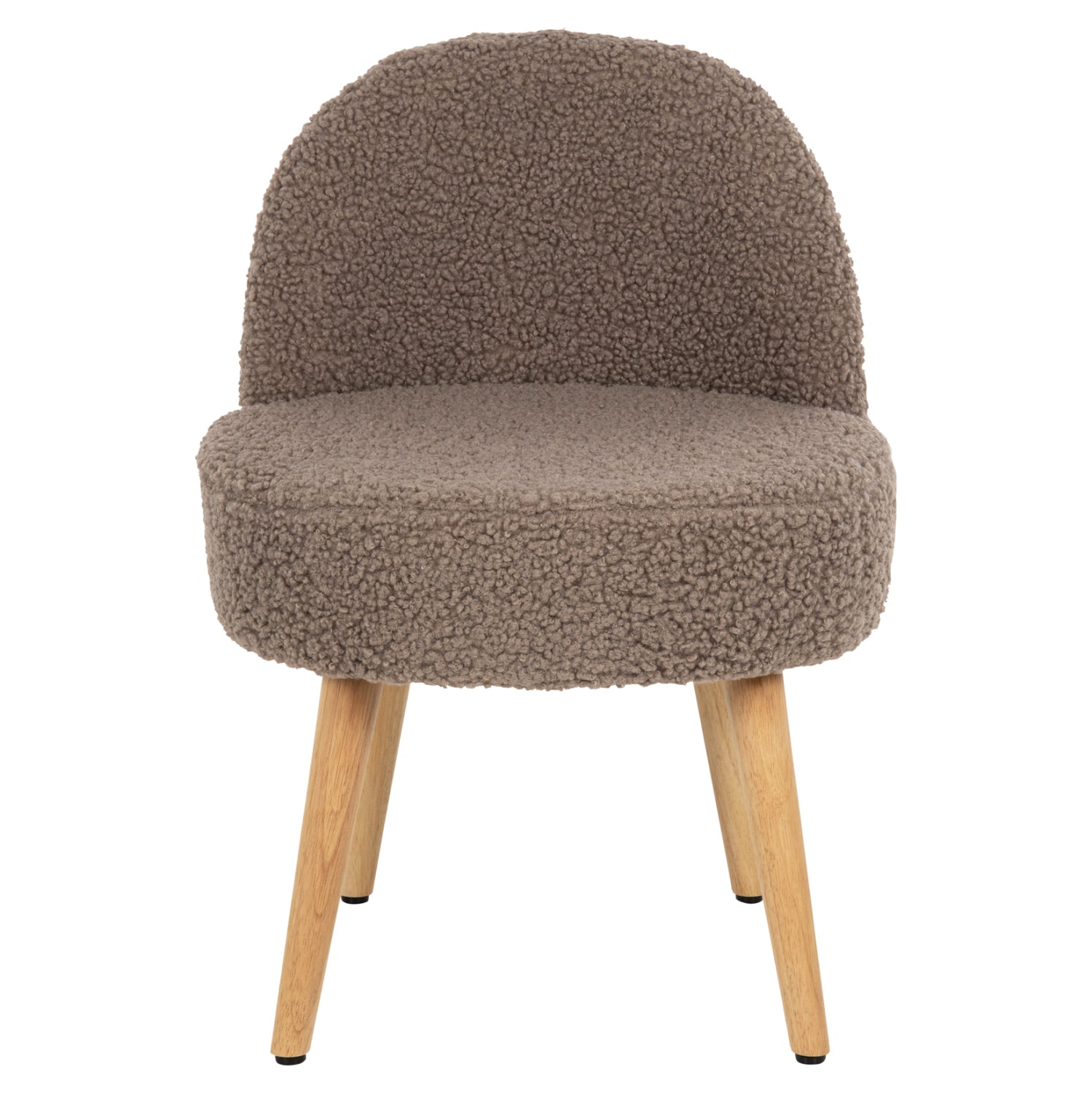 Taburet cu spătar foarte jos, tapițat cu material textil bouclé cald în nuanță maro deschis, cu picioare din lemn în nuanță naturală.