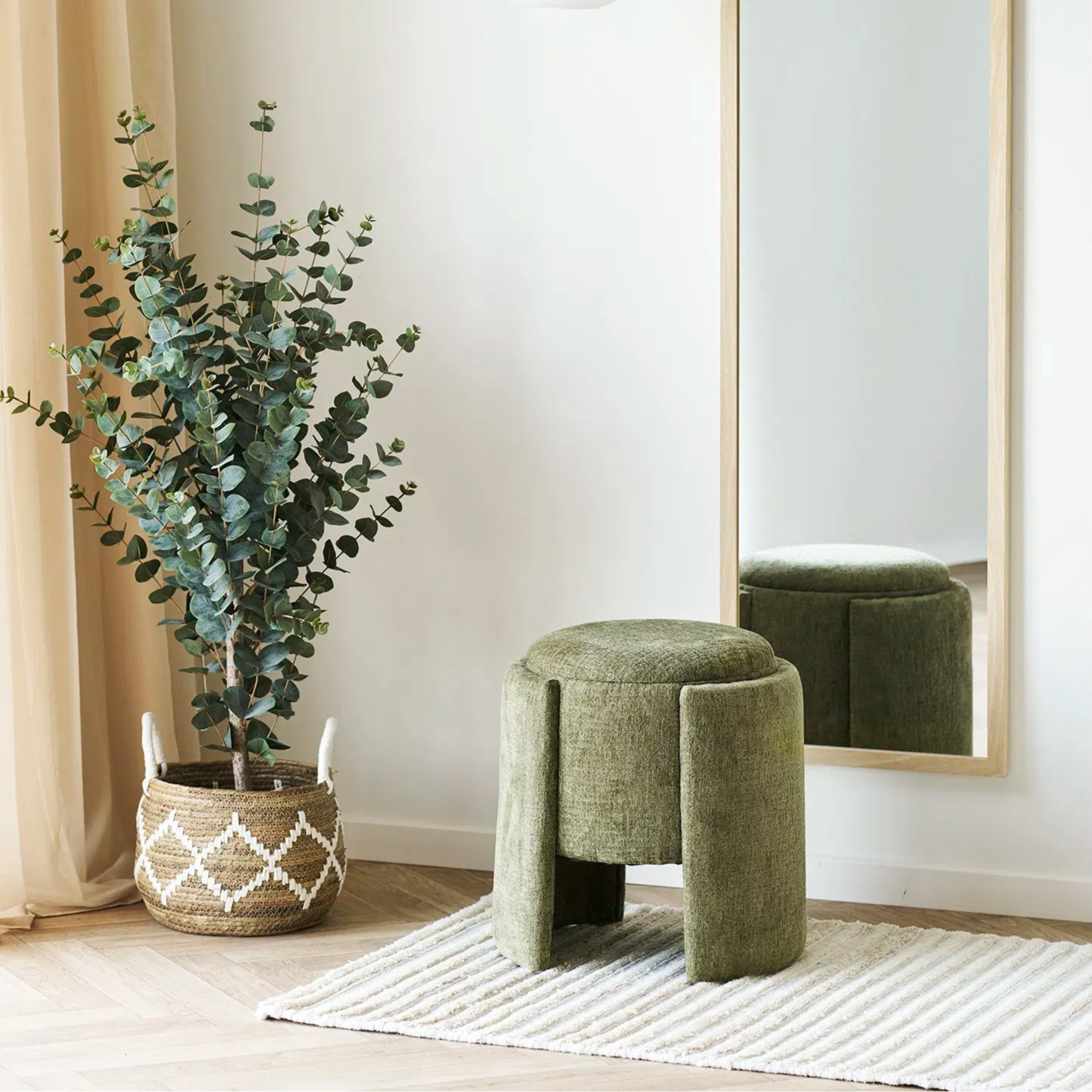Taburet cu spatiu de depozitare, din placaj, spuma, material textil 100% poliester (tip chenille).