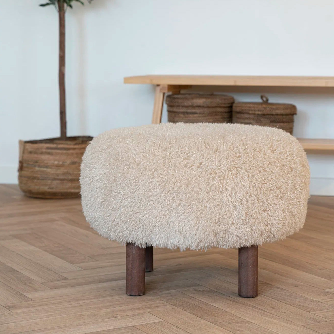 Taburet din lemn de pin, placaj, spuma poliuretanica, tapiterie 100% poliester (blana artificiala).