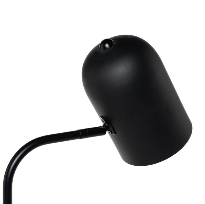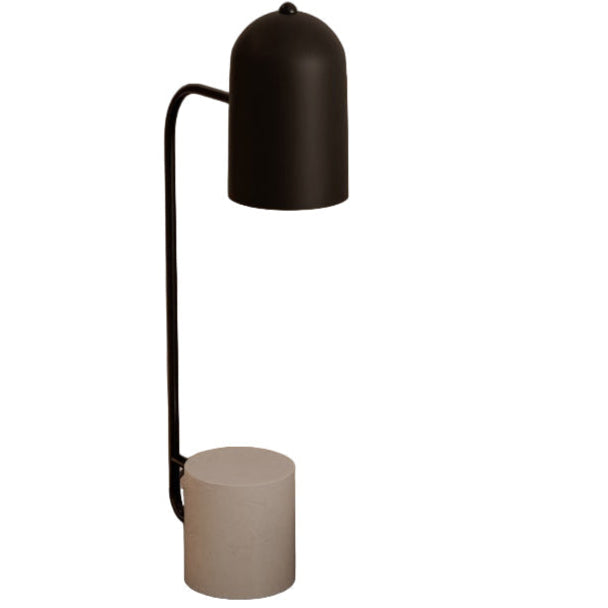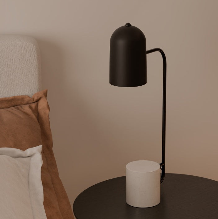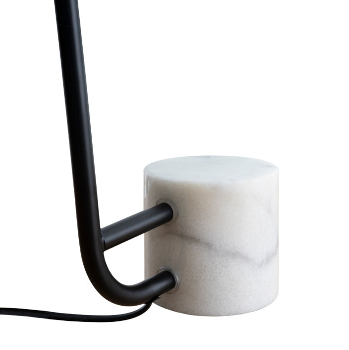 Lampă de masă cu ramă metalică neagră și bază din marmură albă.