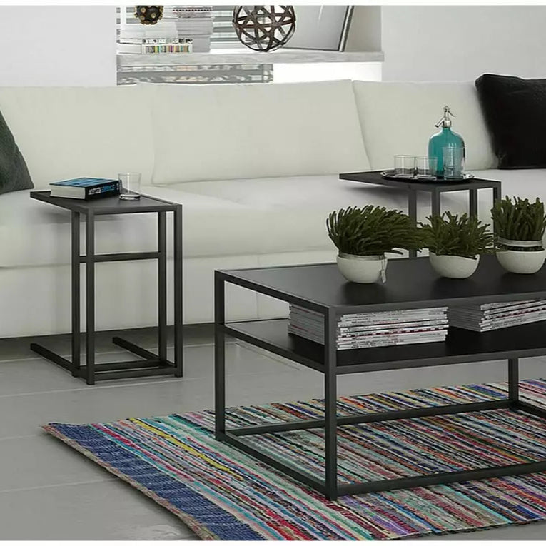 Masuta cu cadru metalic negru si blat din placa laminata.