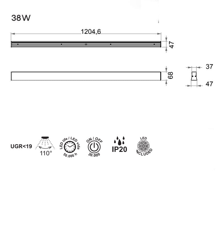 Tip LED: 3000K-38W-2850lm/ 4000K-38W-3000lm.