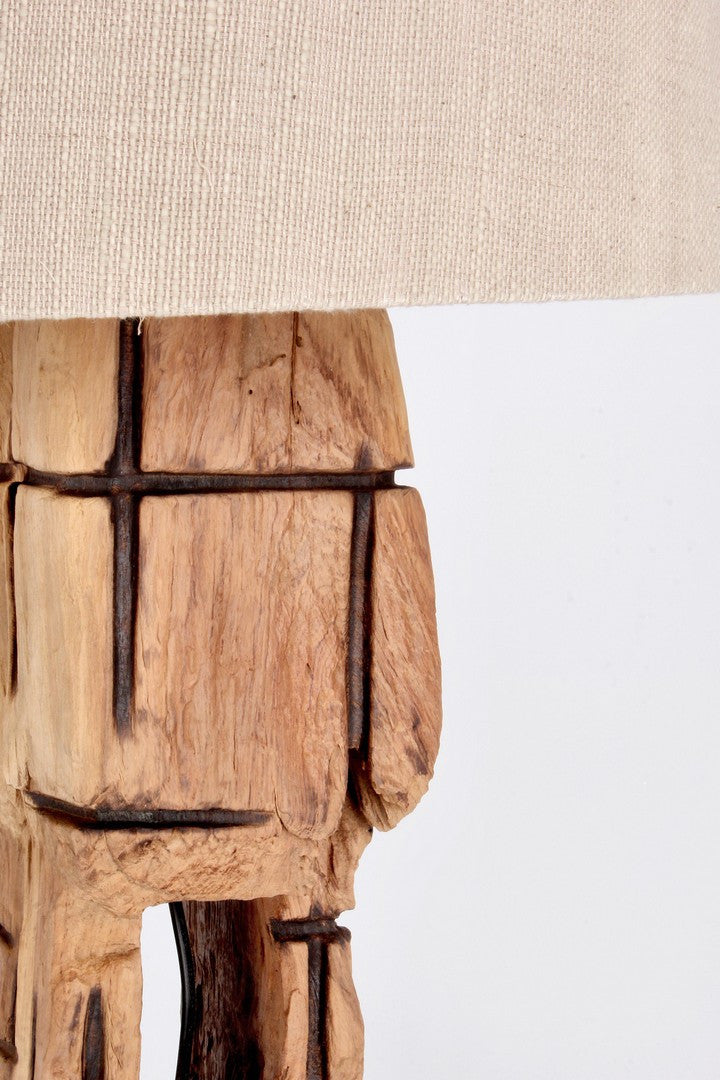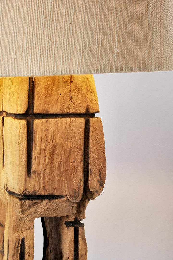 Veioza in stil natural, realizata din lemn de tec reciclat, finisaj pe baza de apa, abajur din material textil (bumbac) si baza din lemn.